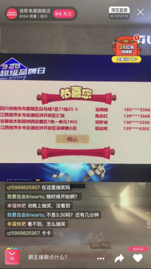 15:30佳歌超级品牌日直播准时开始,揭晓免单大奖。全国消费者一呼百应,千万大奖疯狂来袭。此次活动共设一等奖1名、二等奖2名、三等奖5名、四等奖10名、五等奖20名。