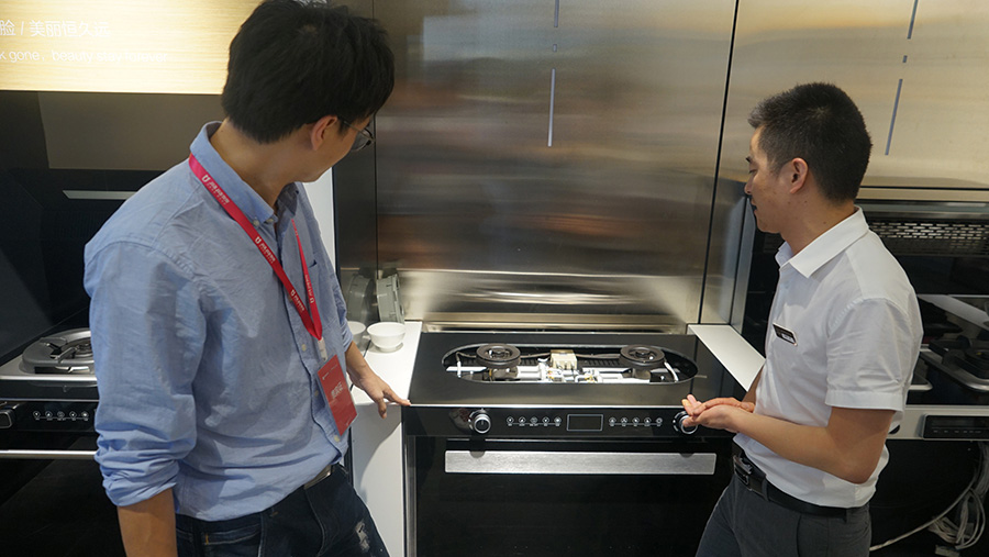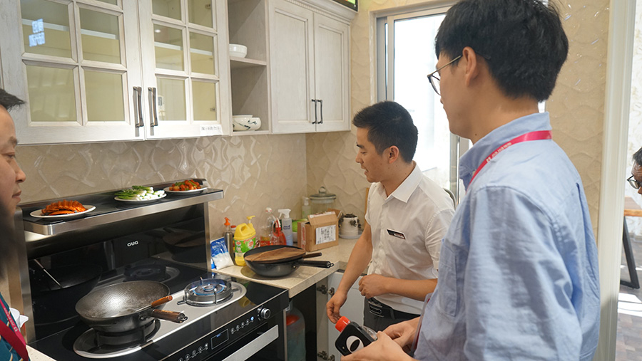 智能化全自动流水线是机器的有效组合,充分体现设备的灵活性。接着,考察团一行就来到佳歌展厅近距离体验了一把佳歌集成灶的使用感受。佳歌所有产品均出自全球设计师之手,真的精雕细琢,整体外观一体成型,百分之99.96的净烟能力,5.0kW超大火力都无一不让考察团拍手称赞。