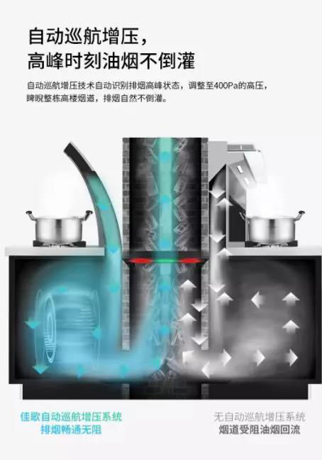采用自动巡航增压科技,通过检测和增压的实时联动,保证自己的烟机排风压高于公共烟道以及别人的排风压。超过420pa的排风压远高于公共烟道内的高峰风压,确保顺畅排烟。