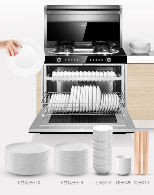 佳歌集成灶行业首创一门式消毒柜,佳歌集成灶的100L超大容量消毒柜,整个内腔都可放置碗盘。可以整整放下10个10寸盘子+14个6寸盘子+12个小碗+20个碟子+40只筷子。