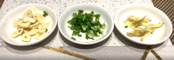 2. 葱、姜、蒜切好备用。