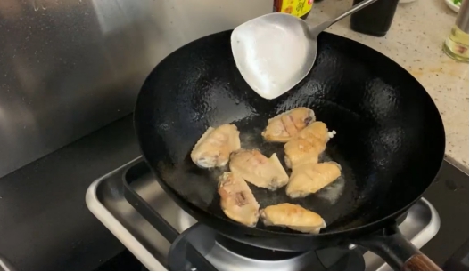 4.锅热油,放入鸡翅煎至两面微微焦黄。