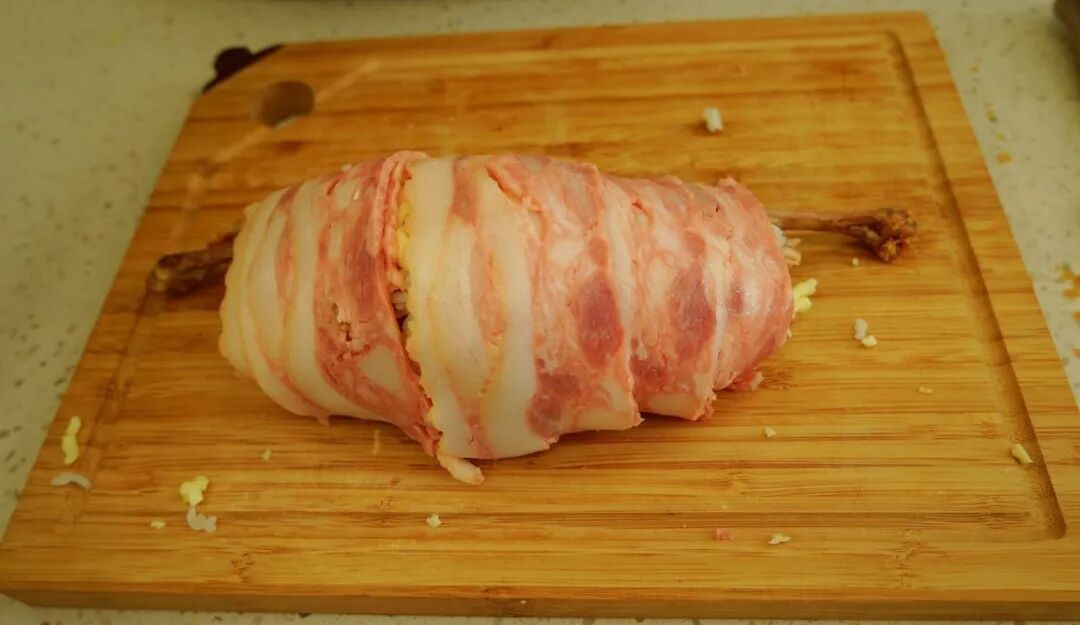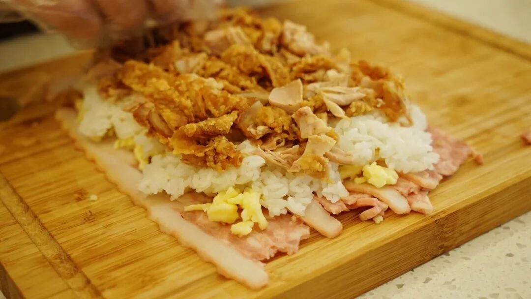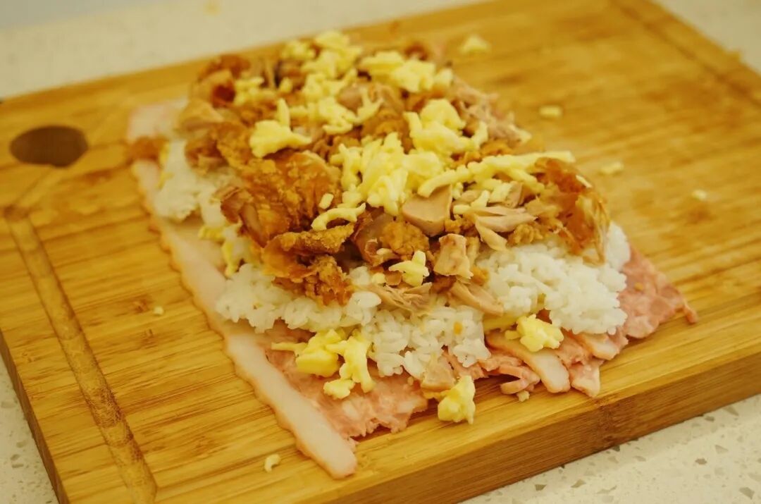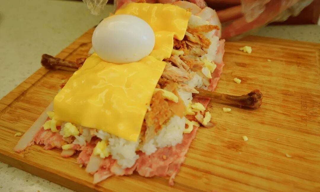 海贼王肉腿 炸鸡腿/米饭/马苏里拉芝士碎/芝士片/ 培根/酱油/蚝油/白糖/生菜/熟鸡蛋 1. 酱油、蚝油、白糖按1:1:1混合调制酱汁。炸鸡腿肉、骨分离,鸡腿肉切碎备用。 2. 培根层叠摆放铺在底层,第二层均匀铺满马苏里拉芝士碎。 第三层平铺米饭 第四层平铺切碎的炸鸡块 第五层再铺一层马苏里拉芝士碎 放两片芝士片,中间放置煮熟的鸡蛋 在两头摆放鸡腿骨,将食材卷起来! 卷的过程要耐心+小心,成品长这样↓ 培根表面涂上调好的酱汁 快用佳歌K1烤箱给孩子做这道正餐、夜宵、小食都适合的海贼王同款肉腿吧!