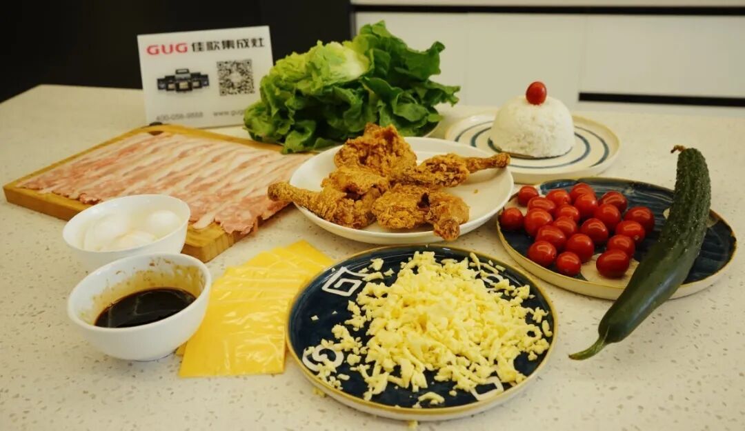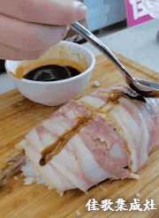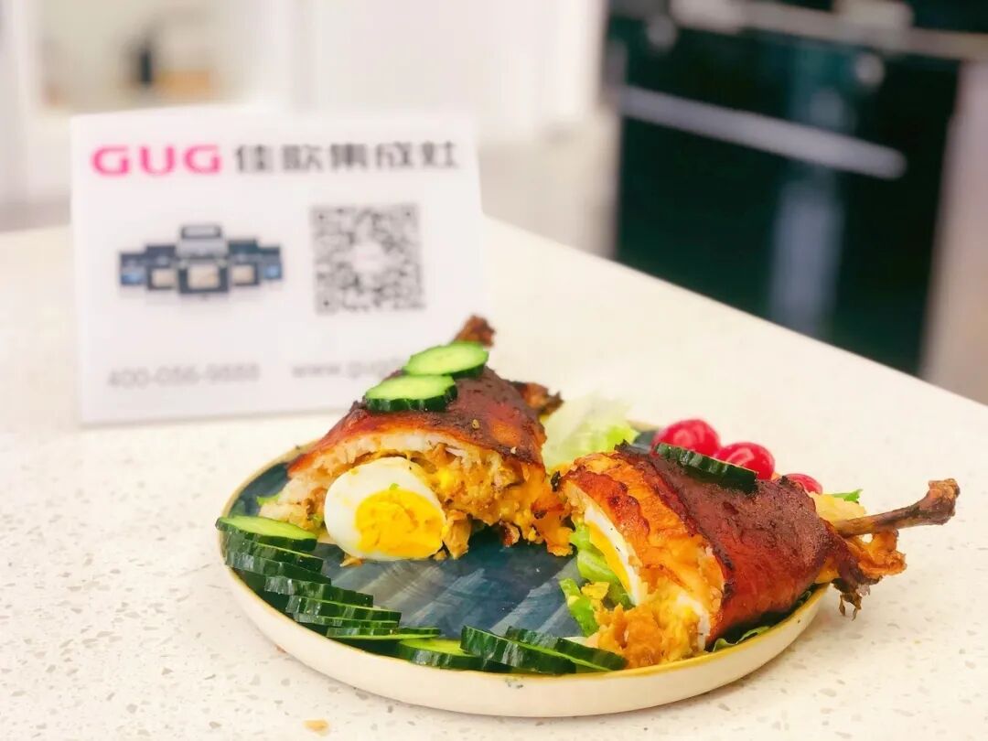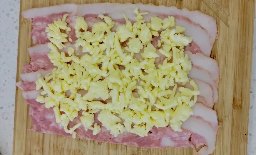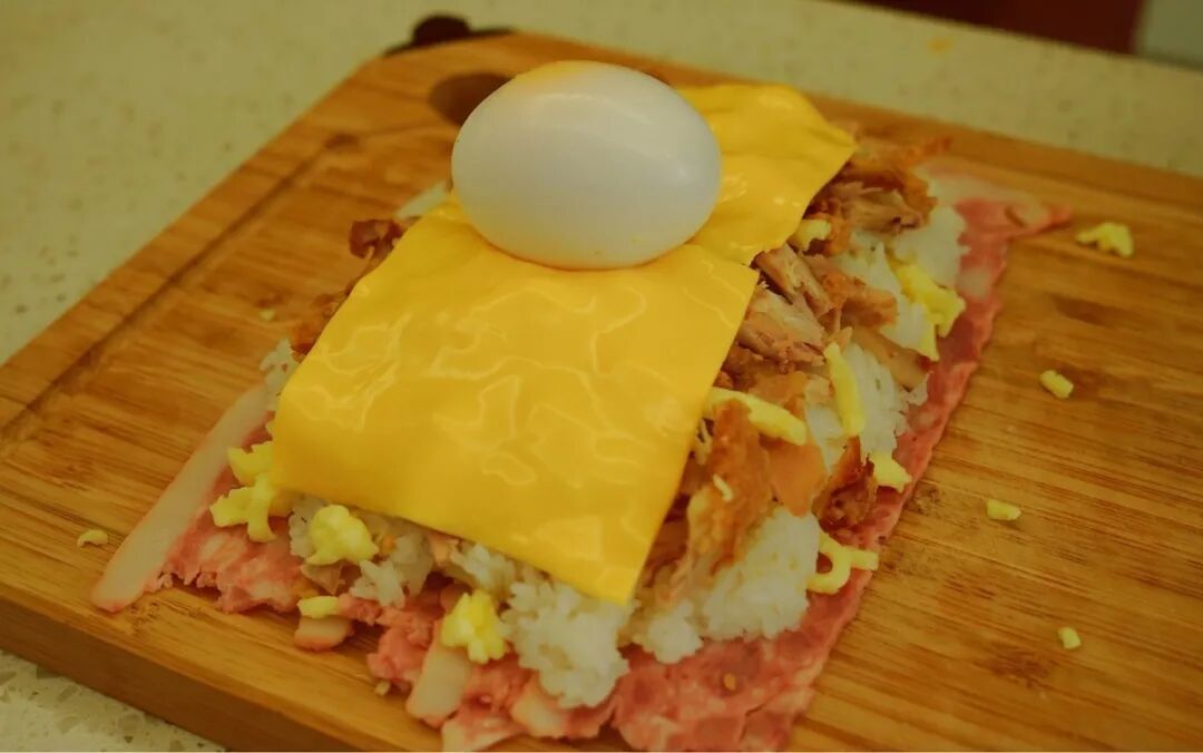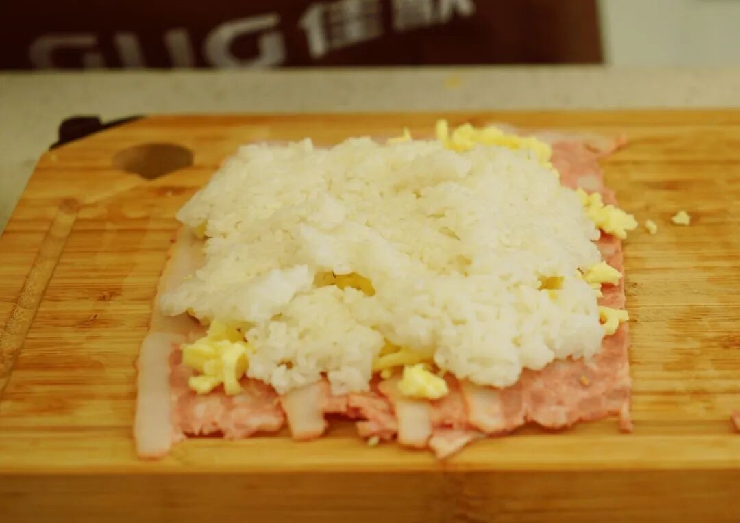 海贼王肉腿 炸鸡腿/米饭/马苏里拉芝士碎/芝士片/ 培根/酱油/蚝油/白糖/生菜/熟鸡蛋 1. 酱油、蚝油、白糖按1:1:1混合调制酱汁。炸鸡腿肉、骨分离,鸡腿肉切碎备用。 2. 培根层叠摆放铺在底层,第二层均匀铺满马苏里拉芝士碎。 第三层平铺米饭 第四层平铺切碎的炸鸡块 第五层再铺一层马苏里拉芝士碎 放两片芝士片,中间放置煮熟的鸡蛋 在两头摆放鸡腿骨,将食材卷起来! 卷的过程要耐心+小心,成品长这样↓ 培根表面涂上调好的酱汁 快用佳歌K1烤箱给孩子做这道正餐、夜宵、小食都适合的海贼王同款肉腿吧!