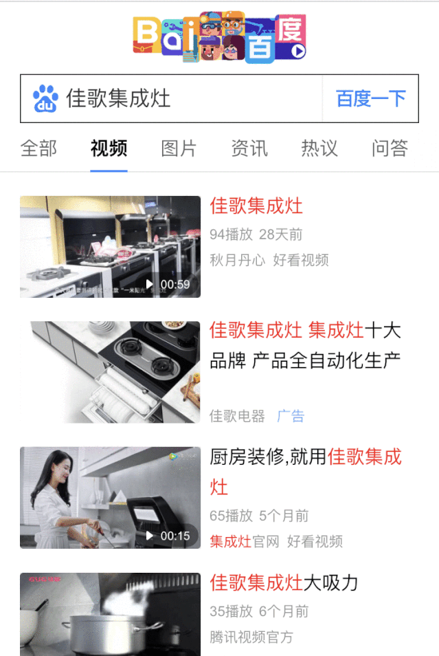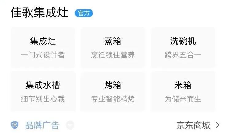 2020年5月,佳歌集成灶百度品牌专区重磅上线! 5月,佳歌集成灶重拳出击,与百度达成品牌战略合作,重磅上线佳歌集成灶百度品牌专区!5月1日起,百度搜索“佳歌集成灶”,所有用户可以在搜索结果首页首位看到佳歌集成灶全方位品牌展示! 百度品牌专区以超大黄金首屏展示位置,以文字、图片、视频等多种广告形式全方位推广展示佳歌集成灶品牌信息,霸屏广告占据你的眼球! 佳歌集成灶最为精华和直接的品牌信息展现,显眼的官网标识可一键直达官网,即时获取佳歌集成灶最新动态和产品资讯! 六类产品入口让你更方便快捷地了解佳歌集成灶产品信息。点击京东商城进入京东佳歌电器旗舰店,查看并选购佳歌集成灶在售产品。 佳歌集团品牌专区以占据手机一整屏的大篇幅塑造佳歌集成灶统一的品牌形象,专区主打佳歌集成灶“一门式集成灶开创者”,集中展示佳歌集成灶的产品设计研发实力。 除了百度搜索结果页首屏首位的黄金品宣专区,用户还能通过百度视频、热议、资讯、问答、图片等百度首页优质频道,查看佳歌集成灶品牌图文视频、资讯问答等资源。 佳歌集成灶建立百度品牌专区,牢牢占据国内主流搜索引擎入口制高点。这是提升品牌声量的重要一步,也是深化消费者对佳歌集成灶品牌认知的关键一步!通过品牌专区,佳歌集成灶专业高端的品牌形象将更直观地传递给消费者,由此增强消费者的信赖感。 同时,这也是佳歌集成灶本年度继高铁列车广告、入驻网易家居TOP品牌馆之后的又一大动作。佳歌集成灶高铁列车头枕巾广告、海报广告等覆盖列车持续曝光全线路旅客。 4月,佳歌集成灶强势入驻网易严选家居TOP品牌馆,成为首批入驻的60家TOP品牌之一。 线上品牌专区+线下高铁广告+网易严选平台入驻,佳歌集成灶以三合一组合拳强势引爆2020!