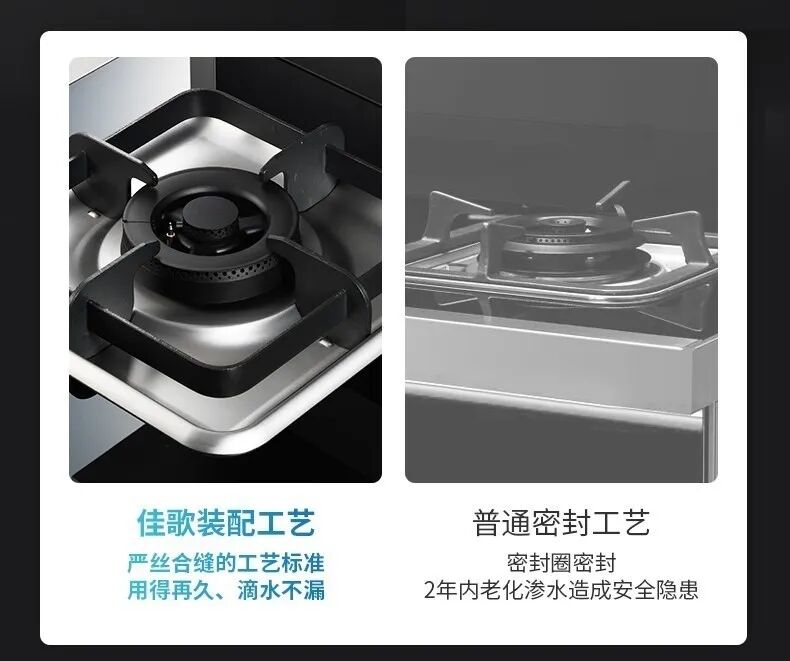 佳歌集成灶台面采用严丝合缝的工艺标准装配,缝隙高于0.2毫米即被判定不合格回炉重造,确保台面密封性。普通集成灶采用的密封圈密封容易出现老化问题,用上几年还会渗水造成安全隐患。