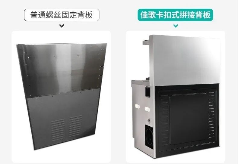 与普通螺丝固定背板不同,佳歌集成灶卡扣式拼接背板作为佳歌的一项专利设计,整机背板无螺丝,不生锈无松动。不沾油喷塑处理背板经630吨液压机冲压变形,用力按压不凹陷,真正坚不可摧!