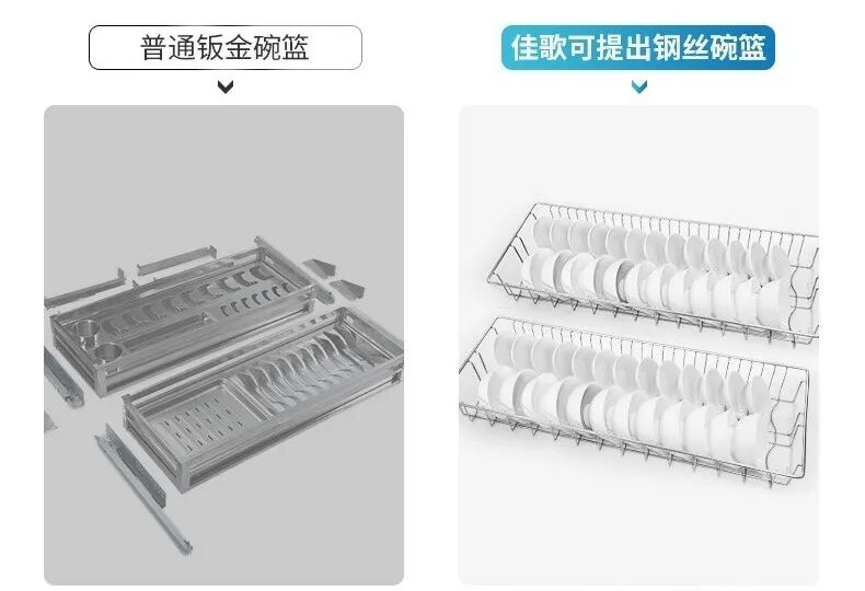 佳歌集成灶带防滑垫的轮滑式拉篮,可直接取出,日常取放碗盘、内部清洁都很方便。耐200度高温的尼龙材质滑轮顺滑好拉。