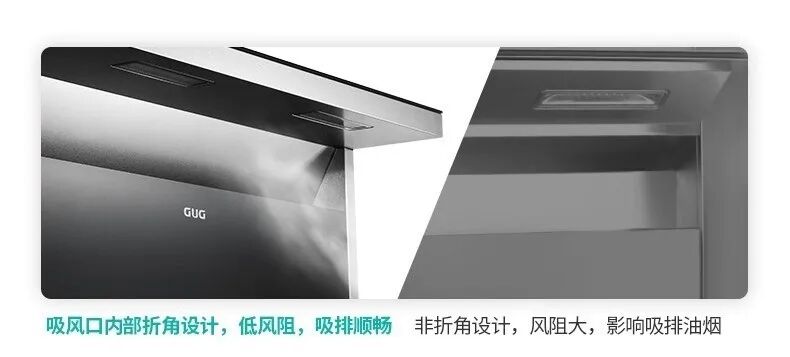 烟腔顶部吸风口,佳歌集成灶采用折角设计,油烟从吸风口顺畅吸入烟腔,风阻更小,让大吸力发挥到极致。
