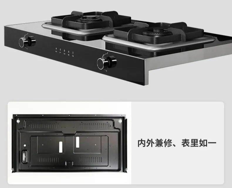F1,H3集成灶前端部分采用无指纹铝合金嵌条,只需要抹布轻轻一擦就可以做到洁亮如新。双显示屏采用5度斜角设计,弧度圆滑外观时尚,工艺要求极高。