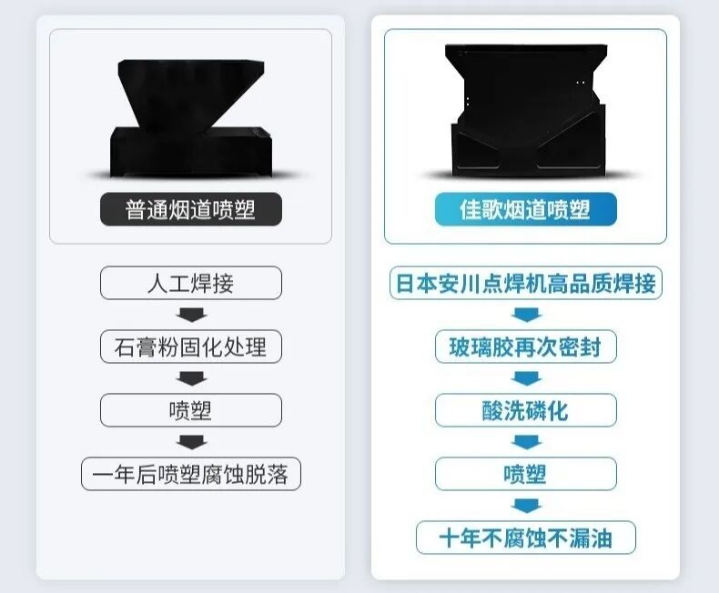 佳歌集成灶烟机系统全喷塑处理,相比普通烟道喷塑增加了酸洗磷化工序,防腐性能提升十倍,普通烟道喷塑一年后就容易脱落,佳歌集成灶烟道喷塑可以做到十年不腐蚀不渗油。