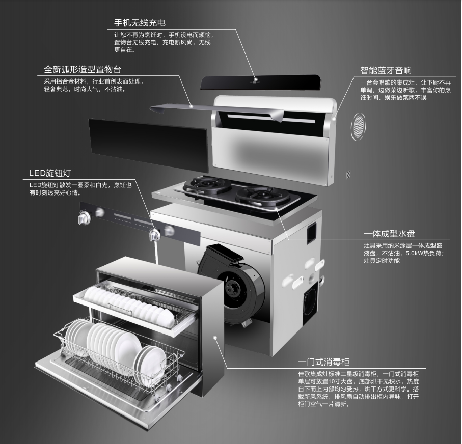 佳歌集成灶每台机器内部都是全包线路布局快插方式连接,烟机、灶具等模块均是独立模块,蜗壳可直接拎出。各个模块线路分离,隔离性好,杜绝安全隐患。