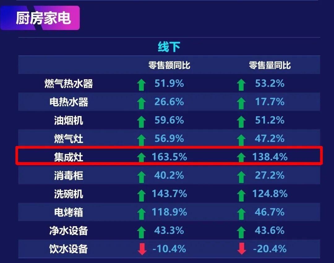 本次疫情过后,集成灶市场始终处于高速发展状态。最近一周数据显示,厨房家电线下零售额和零售量同比增幅集成灶依然稳居第一,相比于其他类目厨房家电,基本形成断层式领先。