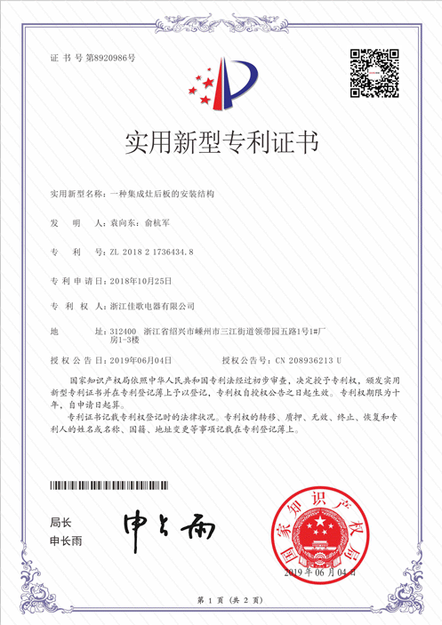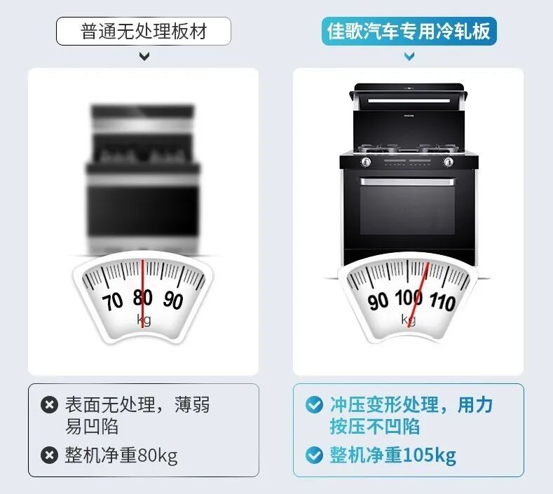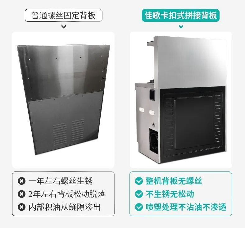 1.现有集成灶多集成双抽屉式消毒柜,无法放入8寸以上大盘,无论叠放或放置在台面,都无法起到本应有的消毒作用,实用性不足; 2.双门式消毒柜多滑轨,不仅会出现抽屉打架导致损坏,并且滑轨本身压缩了实际使用空间。 3.卫生死角多,抽屉封闭空间内各个角落很难打理,滑轨处也需要仔细清洁,长久使用并不友好。 1.打破高度限制,最大程度释放下层空间,10寸大盘可竖直放入充分消毒。 2.滑轮代替导轨,双抽变为一门,不锈钢丝拉篮将所占空间压缩至最低,碗篮可灵活取放,使用更便捷。上层滑轨采用铝合金材质,轻便好拉不生锈易清洁。 3.R角一次成型无缝工艺,非拼缝焊接处理,消毒柜内腔底部左右两边无缝隙,确保无卫生死角,避免二次污染。 1.非模块化设计集成灶牵一发动全身,一处坏整机修,影响消费者日常工作和生活。 2.非模块化设计的集成灶在拆卸安装上需要消耗大量时间力气,整机清洗保养费时费力。 3.许多集成灶拆开后可以见到内部杂乱无章甚至裸露在外的线路,在厨房空间恶劣的使用环境下,容易造成短路、老化等情况。 1.佳歌集成灶整机模块化设计,机头、灶台、柜体可分离,极端情况下灶具和消毒柜可单独使用,无论安装拆卸维修还是定期清洗保养都十分方便。 2.佳歌集成灶每台机器各个模块独立,蜗壳也可以直接拎出,实现各个模块线路分离,隔离性好。机器内部均采用全包线路布局,快插方式连接,线路保护更安全,杜绝安全隐患。 1.现有市面上大多采用螺丝固定式背板,容易产生很多划痕,外露螺丝很容易生锈,长期使用还可能脱落,有渗油风险。 2.由于消费者难以注意到背板,许多集成灶仅仅使用一块薄薄的不锈钢板做背板,按压会凹陷,长期使用易生锈,品质堪忧。 1.佳歌采用卡扣式拼接背板,完全杜绝螺丝固定式背板生锈松动问题,长久使用不渗油。 2.佳歌集成灶背板采用汽车专用冷轧板,以630吨液压机一次冲压成型,板身变形处理进一步升级背板牢固度,同时表面进行喷塑,不沾油不渗透,品质有保障。 佳歌集成灶在研发中不断创新,在工艺上精益求精,每一项专利技术都以更好的设计、工艺和选材保证消费者更佳的使用体验!