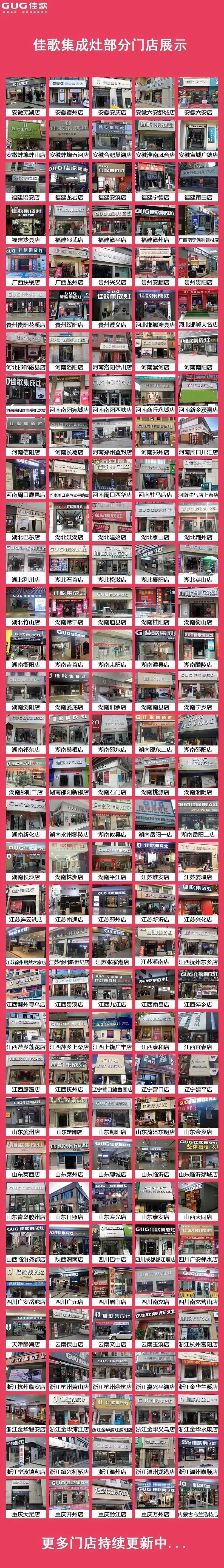自品牌成立以来,佳歌集成灶以佳速度席卷全国,强势扩张佳歌版图,现已强势进军全国二十多个省,三百多座城市! 为迅速打开市场,佳歌集成灶大手笔投入线上线下媒体渠道,形成铺天盖地的全方位品牌宣传网。电视台央视广告每日轮播,浙江教育科技频道聚焦前沿为佳歌做品牌专题报道,线下高炮、高铁、客车、公交车、出租车广告获得亿级曝光,腾讯家居、网易家居、各大集成灶网为佳歌集成灶发文宣传,百度建立佳歌集成灶品牌专区。 继京东、苏宁、天猫三大线上网络销售平台之后,佳歌集成灶今年又以头部家居品牌身份,首批入驻网易严选,多电商平台一同为佳歌集成灶品质背书。 信得过的大品牌加上靠得住的好产品,佳歌集成灶将以佳速度开拓更辽阔的广袤疆土!