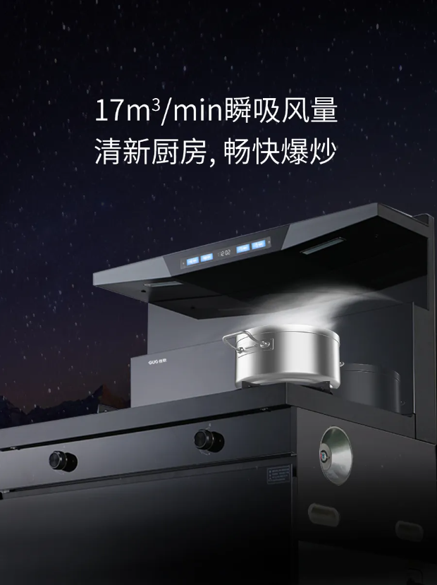 佳歌A12集成灶,17m³/min排风量,360Pa大风压,像飓风般瞬吸油烟,快速净化厨房空气。