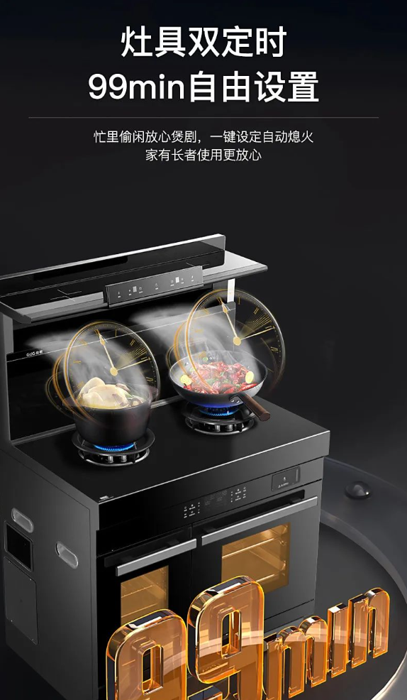 佳歌A3DZK集成灶搭载“双灶定时” 功能,99min可自由设置,一键设定自动熄火,规避隐患,保障厨房安全。