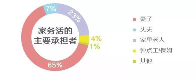 据社会科学文献出版社发布的《中国女性生活状况报告(2017)》显示:中国女性每天的家务劳动时间达到2.6小时;妻子以65%的压倒性占比成为家务活的主要承担者。