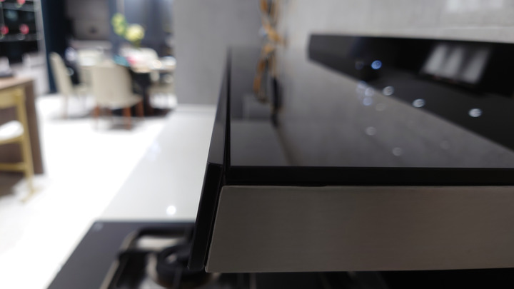 由国内知名设计公司洛可可参与设计的刘海屏烟机头,无疑是整个集成灶的C位,枪灰色拉丝纹理的斜面,看上去充满高级感。