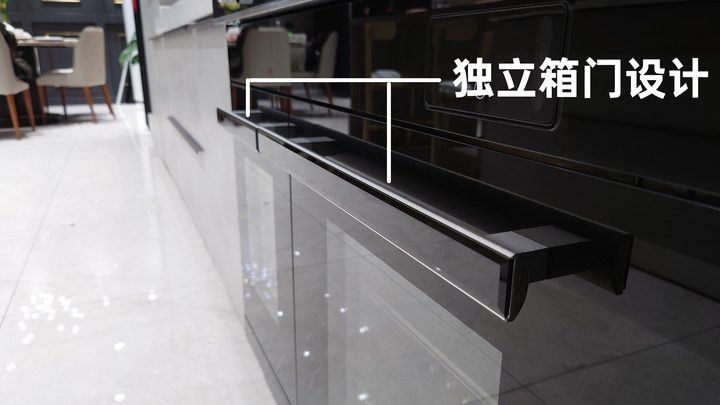 金属材质的蒸、烤箱门把手,久经使用也不易变形松动,表面另嵌入了黑晶玻璃提升质感。