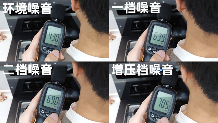 烟机的噪音表现也十分不错,哪怕是最大的增压档,分贝值也只在70.5dB(A)附近,符合国家标准要求。