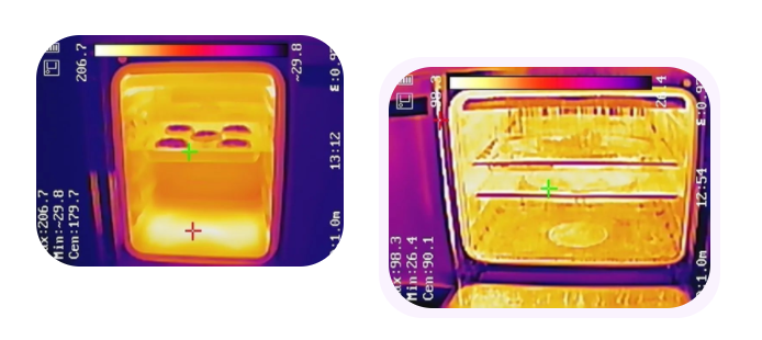 分体蒸烤的效率很高,半小时不到两边都完成了烹饪。打开箱门,通过热成像图可看到烤箱的底部热管也有参与烹饪,因此腔体温度非常均匀。